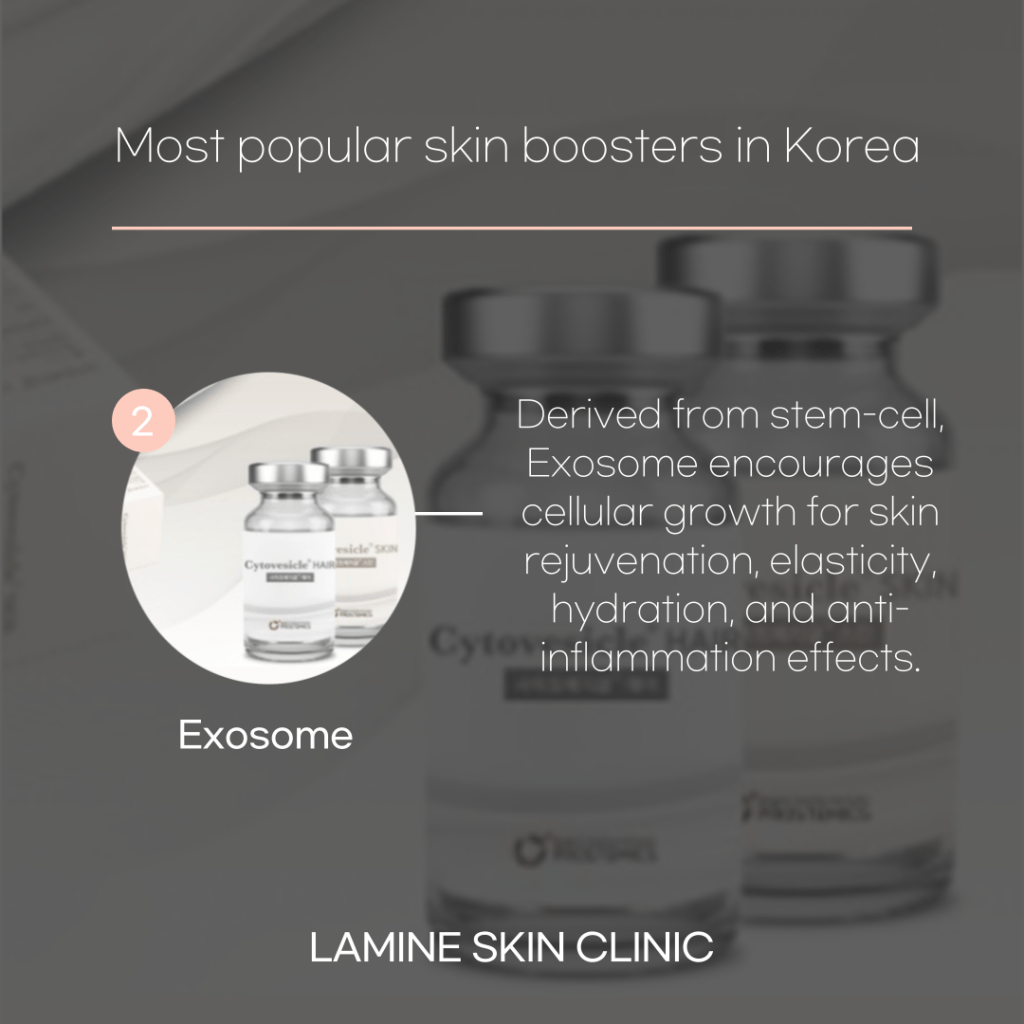 Exosome is an intercellular communication substance that holds the ability of stem cells–which takes care of damaged skin–and activates the energy within natural cells. This skin booster consists of 5 types of growth factors, 6 types of peptides, 19 types of amino acids, vitamin and mineral, glutathione, and other various active ingredients for a superior skin regeneration.