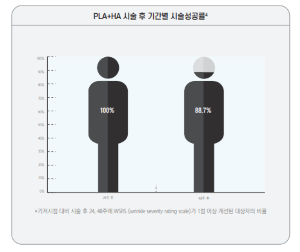 In a survey conducted about the effects of PLA+HA amongst 54 Korean patients, 100% experienced skin enhancement effects after 24 weeks, and 88.7% experienced skin enhancement effects after 48 weeks! This result goes to show that with Juvelook, there is a definite effect for any patient who undergoes the treatment.