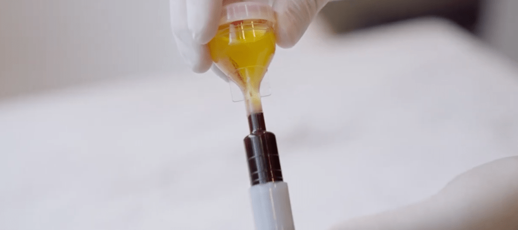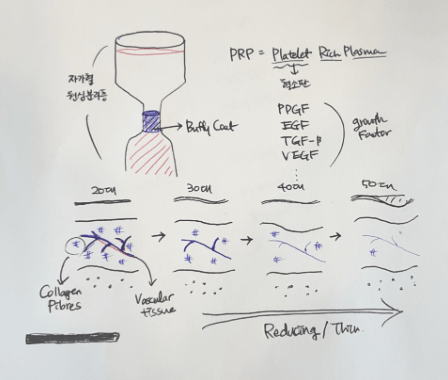 After drawing a blood sample, we centrifuge the sample so the platelets become separated from the blood layer. This layerㅡalso known as the ‘buffy coat’ㅡis where the PRP is. There is only as much as 1cc from one blood sample, so this is a precious anti aging agent!